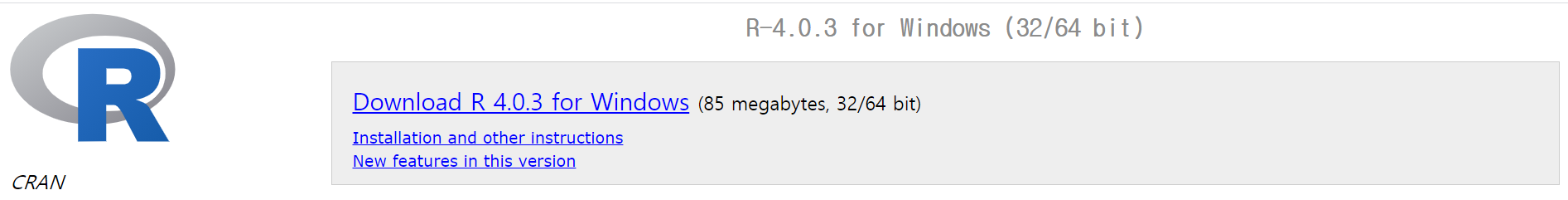 <Download R x.x.x for Windows>를 클릭하여 R 설치 파일을 다운로드해줍니다. 이때 R은 업데이트된 릴리즈 번호(x.x.x)로 바뀌기 때문에 최신버전을 다운로드해주시면 됩니다.