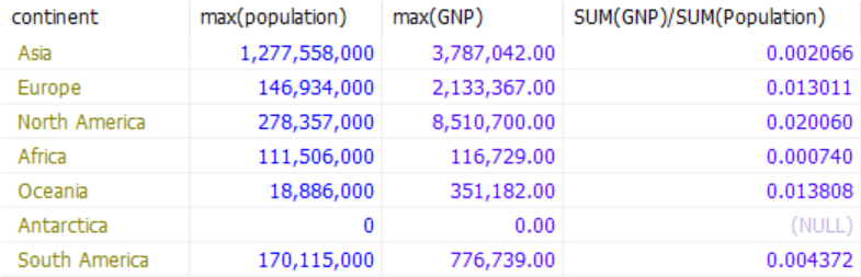 - 대륙별 평균 인구수와 평균 GNP 결과를 인구수로 내림차순 정렬