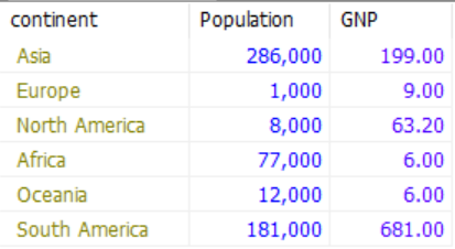 SELECT continent, SUM(Population) as Population, SUM(GNP) as GNP