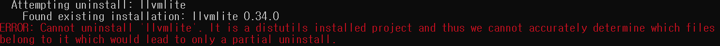 'ERROR: Cannot uninstall 'llvmlite'. It is a disttutils installed project and thus we cannot accurately determine which files belong to it which would lead to only a partial uninstall.'